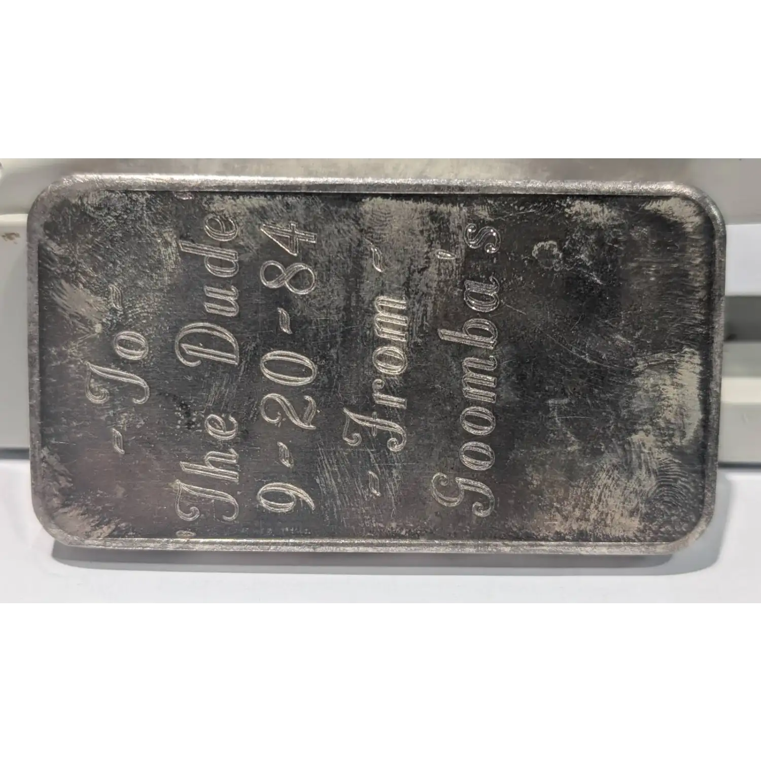 *Bars are engraved on the back: To The Dude 9-20-84 From Goomba's