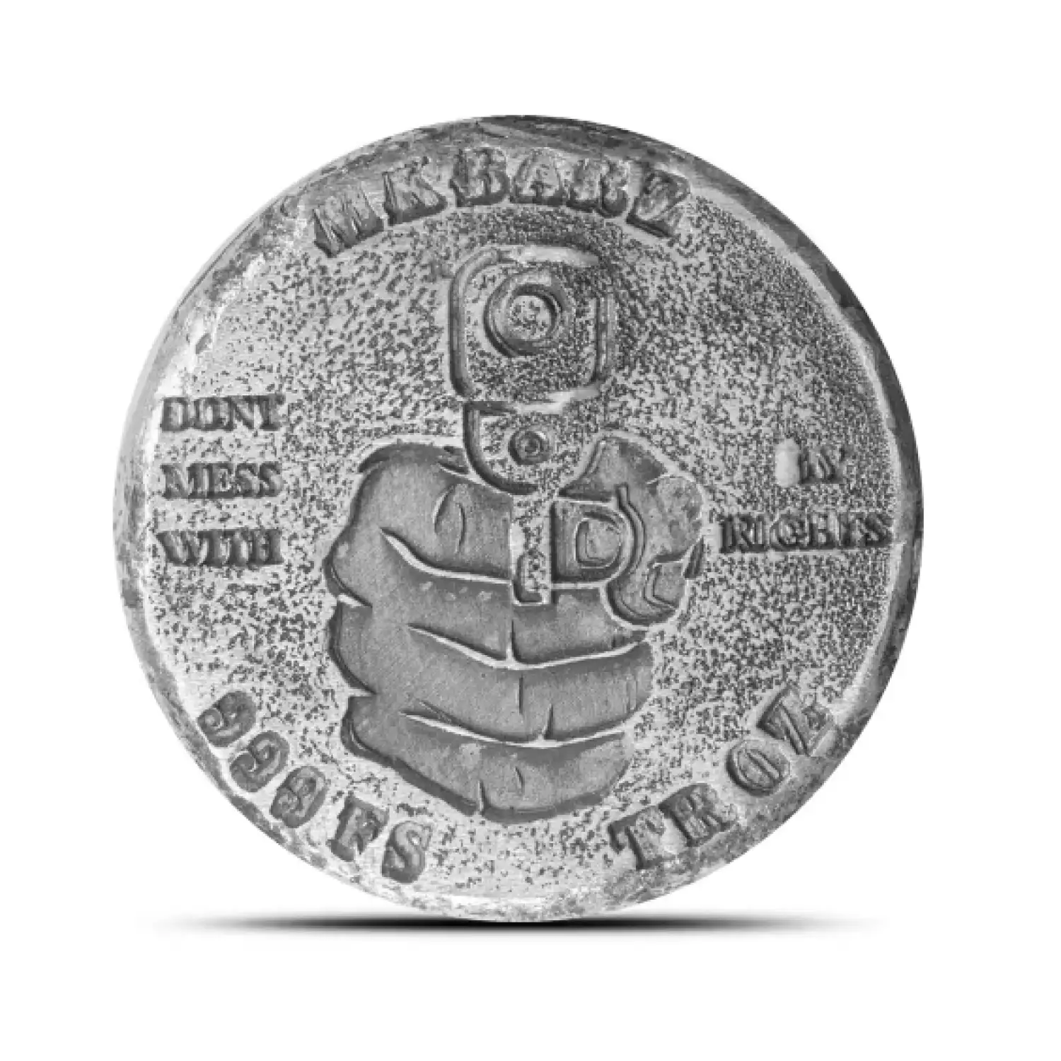 For the obverse field of the 1 oz MK Barz Don’t Mess with My Rights Silver Round, you will find a gorgeous image crafted by MK Barz and Bullion. The design showcases a fist closing around the hilt of a gun which is pointed right at the viewer in frightening proximity. The inscriptions on this side of the round include; “Don’t mess with my rights,” and the weight and purity of the round.