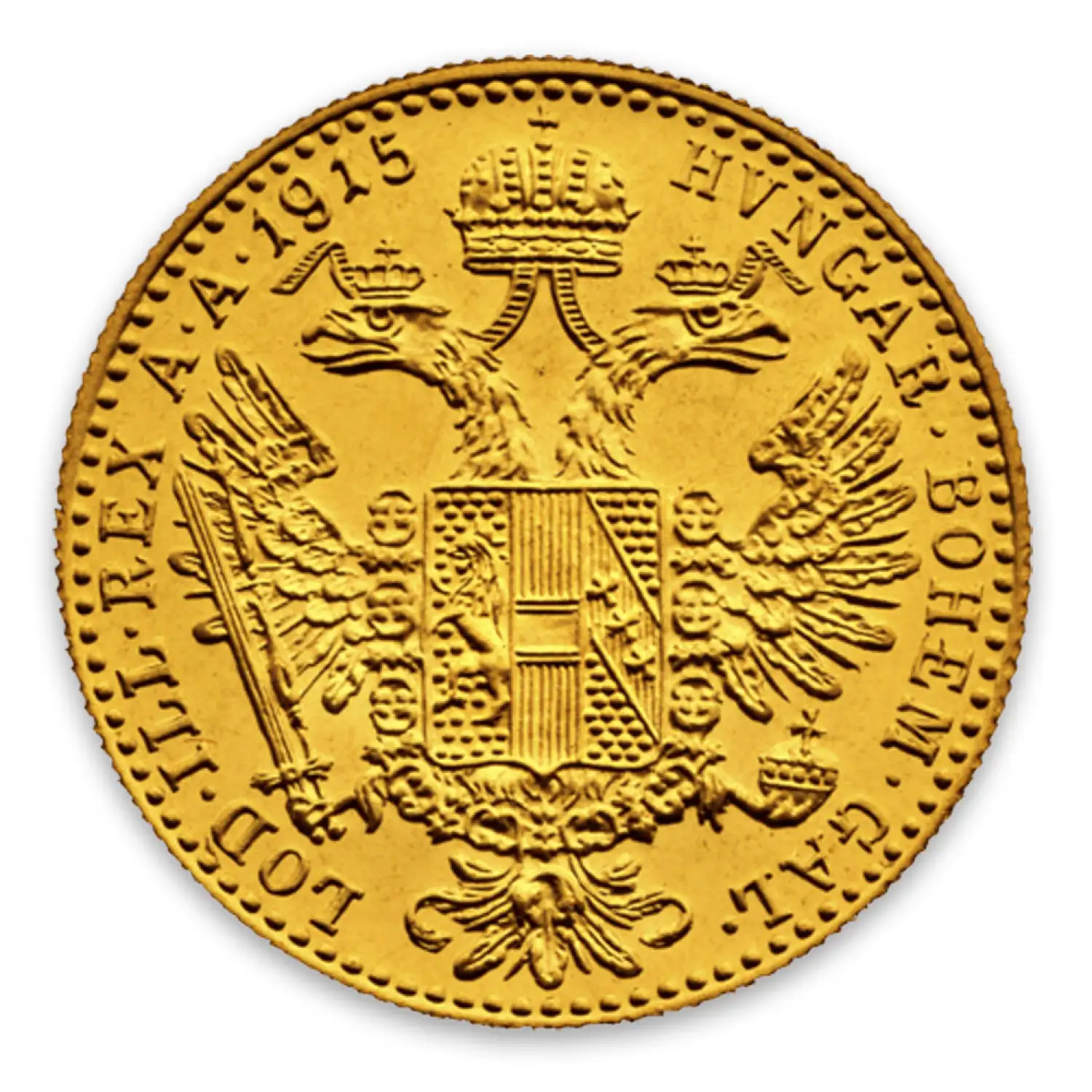 The reverse side of Modern Re-strikes 1 Ducat Coins features the Austro-Hungarian Empire’s coat of arms. The obverse displays a young effigy of Franz Joseph I.